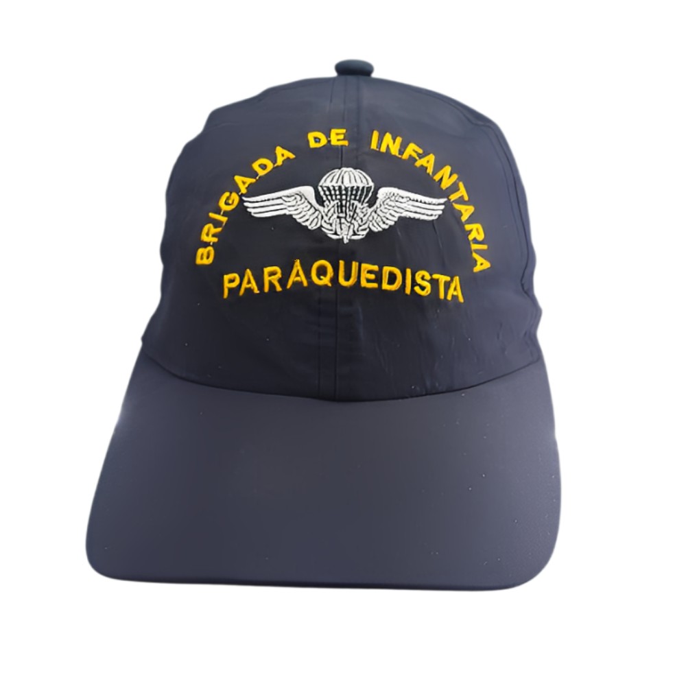 Boné paraquedista na cor preta, confeccionado em poliéster, garantindo leveza, conforto e durabilidade. Possui bordado “Paraquedista” em uma das laterais e bandeira do Brasil bordada na outra, valorizando o espírito militar e o patriotismo.